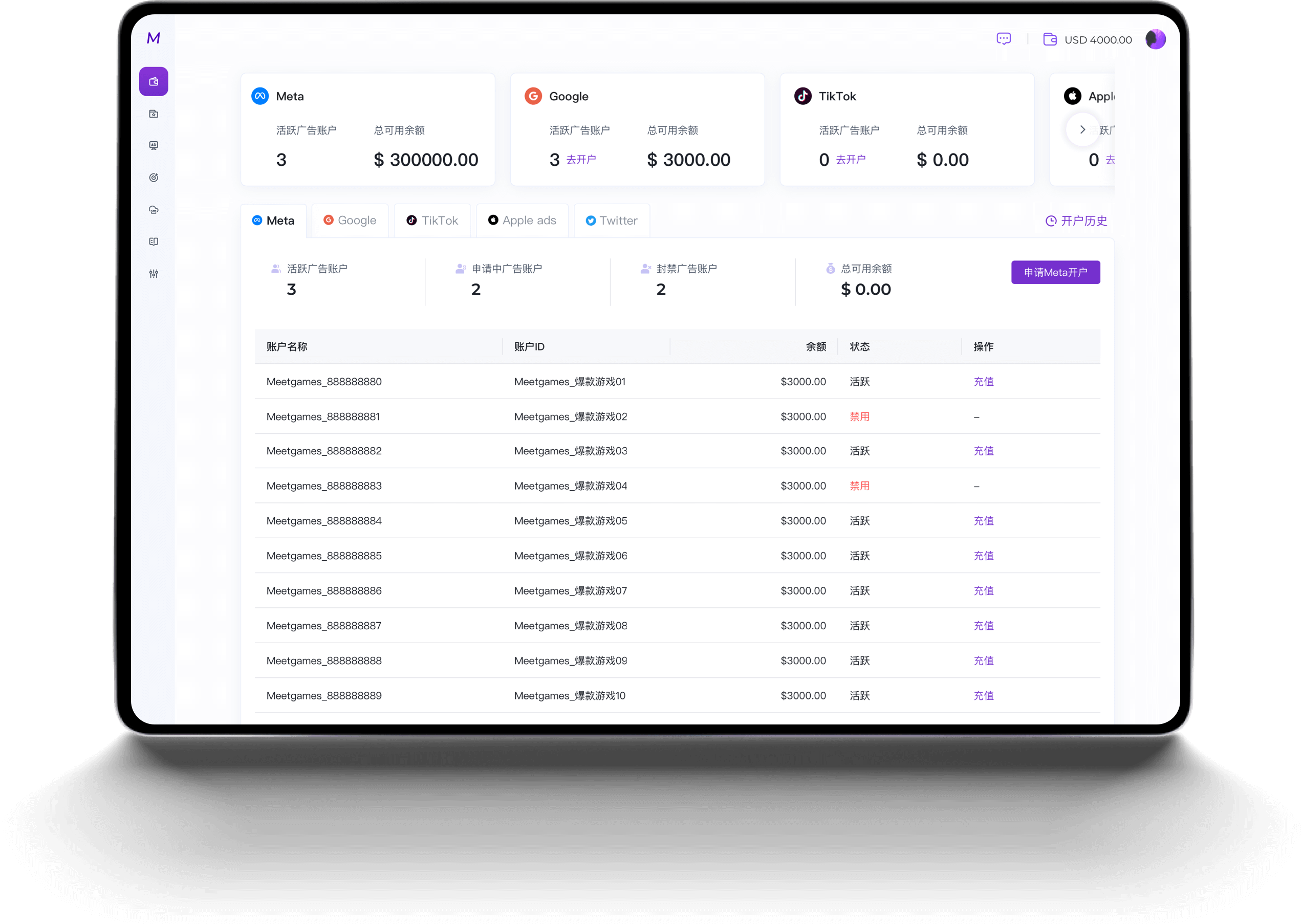 集合了各大海外媒体平台资源,赞成多媒体开户、充值、账户授权等功能;一站式高效管理多渠道、多账户广告;绿色通道高效开户、赞成多币种充值,并且提供专业团队全程答疑指导。